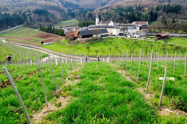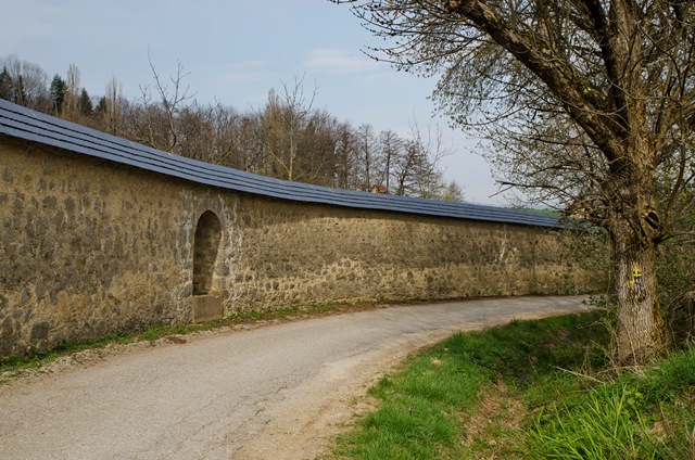 Tam v križišču nadaljujemo naravnost po asfaltirani cesti in se med zidanicami čedalje bolj strmo vzpenjamo med vinogradi. Po dobrih 200 metrih v križišču z asfaltirano cesto zavijemo levo in mimo Vinotoča Drča, za katerim se spet držimo levo in v naslednjem križišču pridemo na makadamsko pot. Ves čas se držimo levo in se slednjič ob vinogradu vzpnemo na razgledno točko nad samostanom. Kasneje se kolovoz levo precej strmo spusti do asfaltirane ceste, ki vodi ob obzidju. Držimo se desno in že po dvesto metrih zavijemo s ceste in se ob obzidju po ozki poti mimo transformatorja vzpnemo levo – tu si samo skrajšamo pot – in se (še vedno ob obzidju) vrnemo do Muzeja na prostem Pleterje.