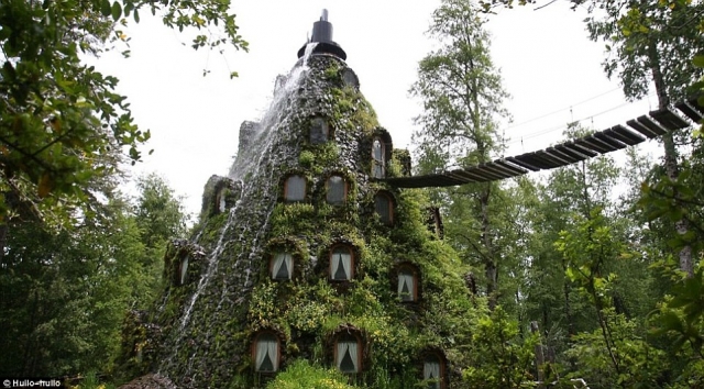Nenavadni hotel se nahaja v biološkem rezervatu Huilo Huilo, ki se razteza na površini 1215 kvadratnih kilometrov. Gre za eno najlepših in hkrati najbolj ogroženih območij na svetu, ki daje dom številnim rastlinskim in živalskim vrstam. Tudi ustvarjalci hotela so zgradbo želeli čim bolj približati naravi. Tako je v celoti zgrajena iz lesa in kamna, na vrhu pa ima posebno fontano, iz katere po stavbi teče voda in ustvarja umetni slap.